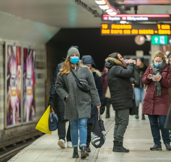 2021年2月10日,在瑞典斯德哥尔摩,人们等待乘地铁。新华社发(魏学超摄)