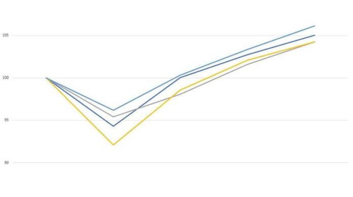 联邦规划局的顾问Bart de Ketelbutter已经做了分析。他把疫情前欧洲国家2019年当作基年,分析各国GDP的变化,以便能够比较欧元区的经济在疫情期间和之后的收缩与复苏。