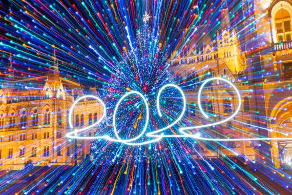 2021年12月29日,在匈牙利布达佩斯的国会大厦前,人们用光画出“2022”字样(长时间曝光照片)。(新华社发,弗尔季·奥蒂洛摄)
