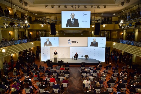 2月19日,在德国慕尼黑,德国总理朔尔茨在第58届慕尼黑安全会议上发言。(新华社记者逯阳摄)
