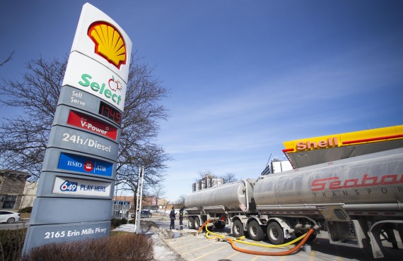 3月4日,油罐车在加拿大大多伦多地区米西索加的一处加油站卸油。(新华社发,邹峥摄)