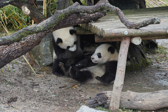 3月21日,在西班牙马德里动物园,大熊猫“友友”和“久久”首次亮相。新华社记者孟鼎博摄