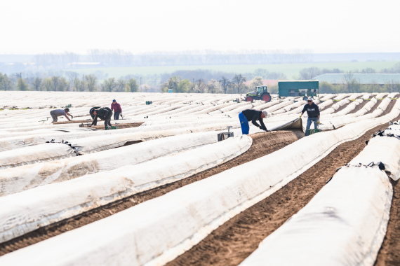 2020年4月17日,农场帮工在德国中部图林根州库茨莱本的一座农场收割芦笋。(新华社发,凯文·福格特摄)