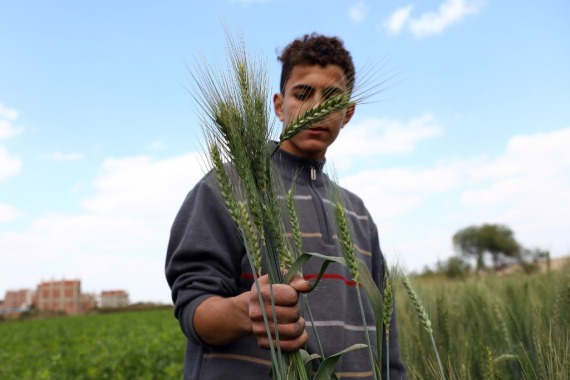 3月14日,农民在埃及盖勒尤卜省的农田中展示麦穗。新华社发(艾哈迈德·戈马摄)