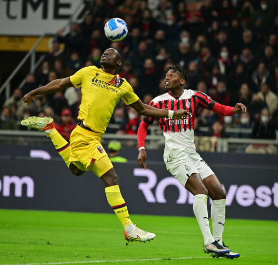 4月4日,AC米兰队球员莱奥(右)与博洛尼亚队球员索马奥罗在比赛中拼抢。 新华社发(阿尔贝托·林格利亚摄)