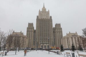 3月28日,在俄罗斯首都莫斯科,行人从俄罗斯外交部大楼附近走过。新华社记者白雪骐摄