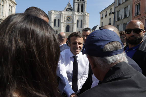 4月21日,法国总统马克龙在巴黎北郊塞纳-圣但尼省参加竞选活动。新华社发(里特·艾斯摄)
