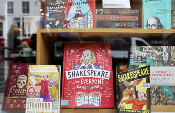 这是4月23日在英国斯特拉特福的一家书店拍摄的关于莎士比亚的图书。(新华社记者李颖摄)