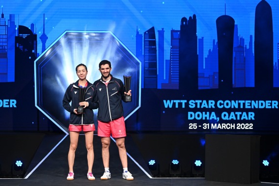 3月31日,在卡塔尔多哈举行的2022年世界乒乓球职业大联盟(WTT)多哈球星挑战赛混合双打决赛中,法国组合勒贝松(右)/袁佳楠获得冠军。新华社发(尼库摄)