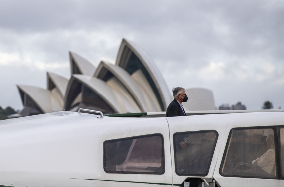 2022年3月30日,在澳大利亚悉尼,一名佩戴口罩的男子乘船出行。(新华社记者白雪飞摄)