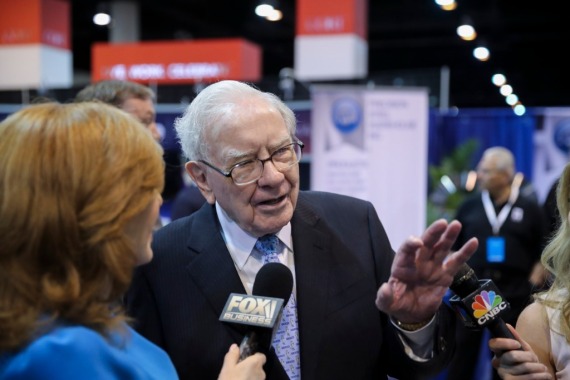 2018年5月5日,在美国内布拉斯加州奥马哈市,伯克希尔—哈撒韦公司董事会主席沃伦·巴菲特(前左二)在股东大会开幕前接受媒体采访。新华社记者王迎摄