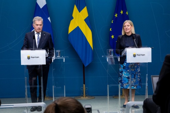 5月17日,在瑞典斯德哥尔摩,瑞典首相安德松(右)和到访的芬兰总统尼尼斯托参加新闻发布会。新华社发(瑞典政府供图/宁尼·安德松摄)