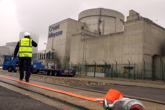 2011年10月18日,在法国南部阿尔代什省克吕阿核电站,参加演习的快速反应小组人员组装完水泵后和指挥中心联络。新华社记者舒适摄
