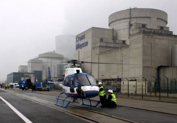 2011年10月18日,在法国南部阿尔代什省克吕阿核电站,参加演习的快速反应小组人员乘直升机抵达核电站。新华社记者舒适摄