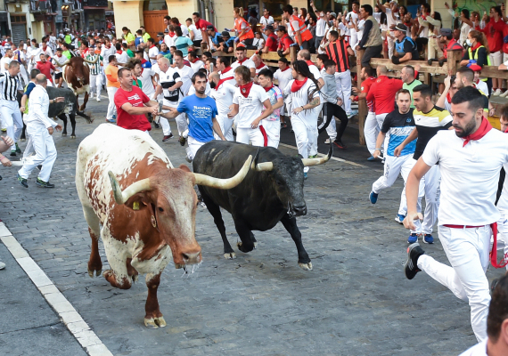 西班牙北部城市潘普洛纳在“圣费尔明”节期间举行的奔牛活动最为著名。在为期一周的活动上,每天上午都有数以百计参与者鼓足勇气,在6头牛追逐下,沿着从牛圈到潘普洛纳斗牛场长850米的路线奔跑。