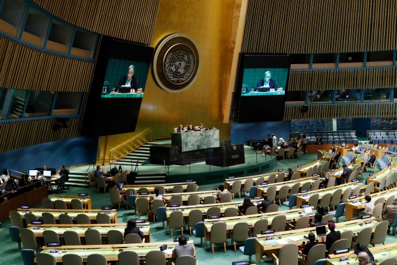 2018年6月12日,在位于纽约的联合国总部,联合国秘书长古特雷斯在联合国大会艾滋病防治辩论会上发言。(新华社记者李木子摄)
