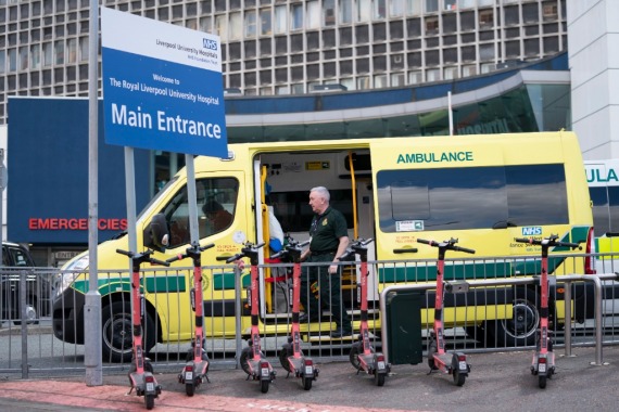 4月1日,在英国利物浦一家医院,一名医护人员站在急救车上。新华社发(乔恩·休珀摄)