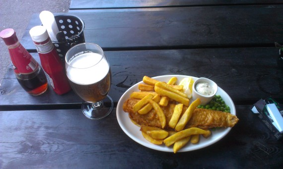 这是2012年7月23日在英国伦敦尤斯顿火车站旁一家餐馆拍摄的英国传统食品炸鱼薯条。新华社记者王申摄