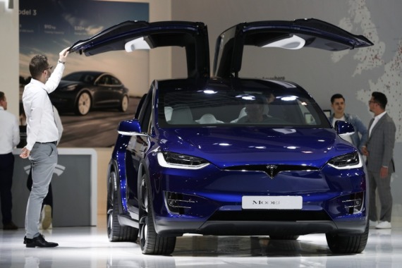 2020年1月9日,在第98届比利时布鲁塞尔车展上,一名工作人员在触摸特斯拉Model X汽车的鹰翼门。新华社记者郑焕松摄