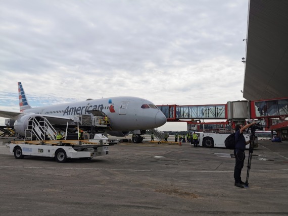 2021年11月15日,美国航空公司的一架客机飞抵古巴哈瓦那的何塞·马蒂国际机场。新华社记者林朝晖摄