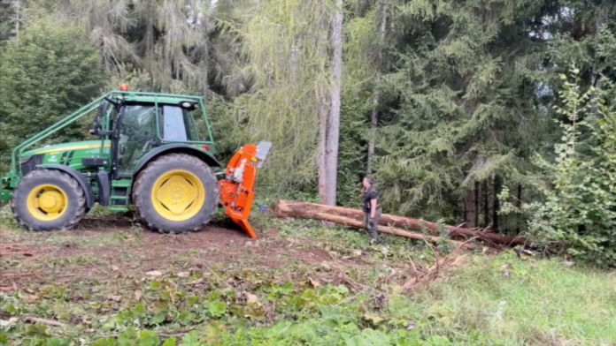 在意大利北部威尼托大区一处林场,一台拖拉机引擎轰鸣,正将一棵新砍断的云杉从树林运至原木堆放区,这里还存放着十余棵长近20米的完整树干等待运输。