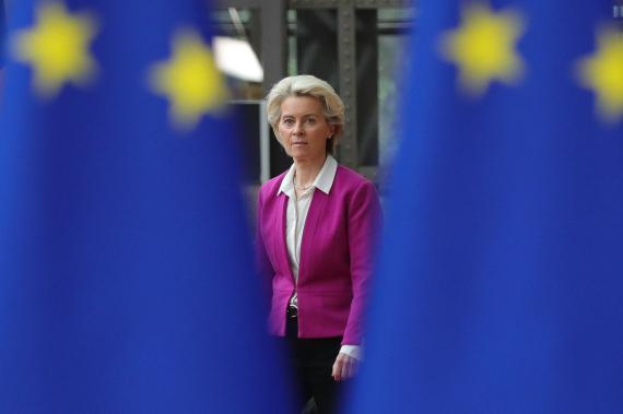 5月30日,在比利时布鲁塞尔,欧盟委员会主席冯德莱恩抵达欧盟总部出席欧盟特别峰会。(新华社记者郑焕松摄)
