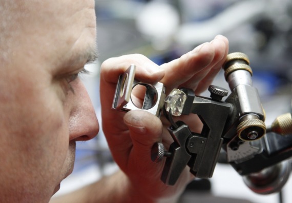 2014年11月7日,在比利时安特卫普,一名技师在观察一颗大钻石的加工情况。(新华社记者王晓郡摄)