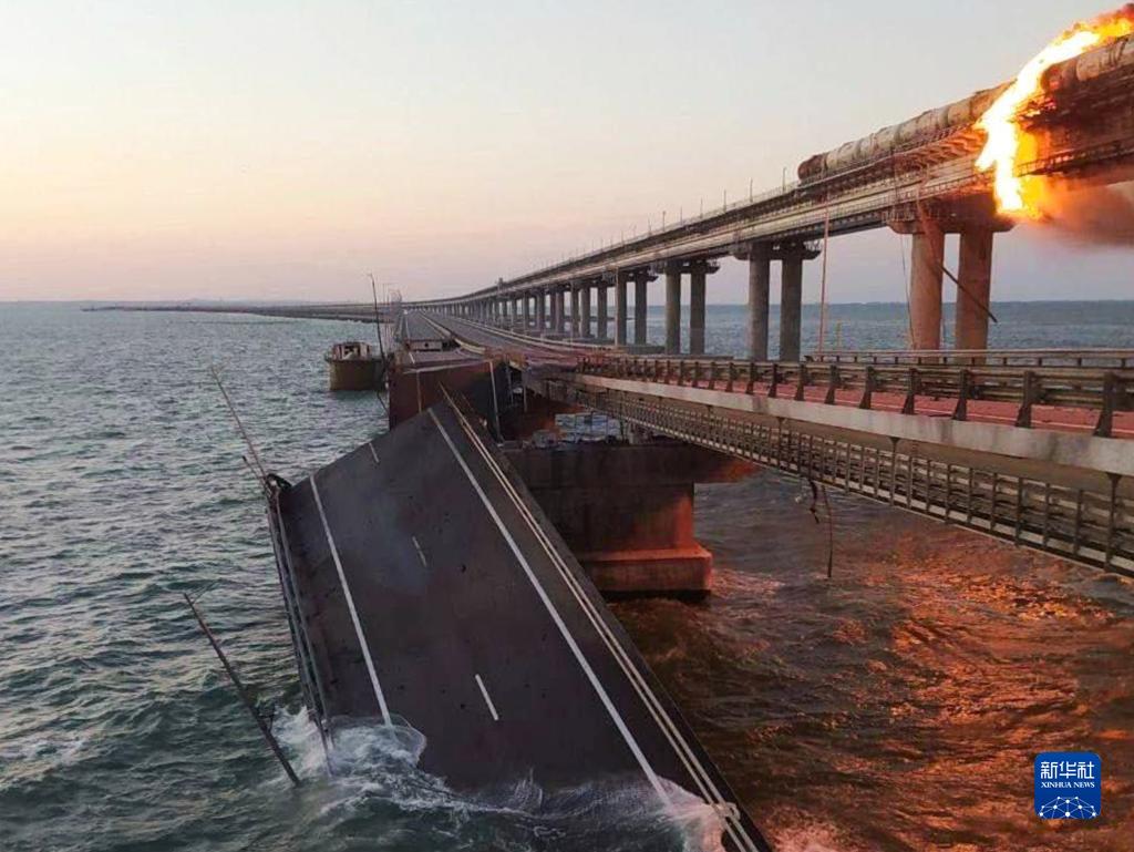 据俄罗斯国家反恐委员会通报,克里米亚大桥公路桥上一辆卡车发生爆炸,导致与公路桥并行的铁路桥上一货运列车上七个油罐被点燃;公路桥部分路段受损坍塌。