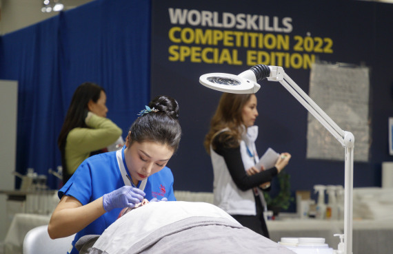 10月20日,重庆城市管理职业学院王珮在芬兰首都赫尔辛基参加2022年世界技能大赛特别赛芬兰赛区比赛美容项目。新华社发(卡勒·帕尔基宁摄)
