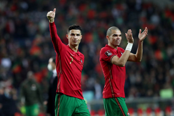 3月29日,卡塔尔世界杯欧洲区预选赛附加赛C组决赛中,葡萄牙队以2:0战胜北马其顿队,晋级世界杯决赛圈。图为葡萄牙队球员C罗(左)和佩佩在比赛后庆祝。新华社发(佩德罗·菲乌萨摄)