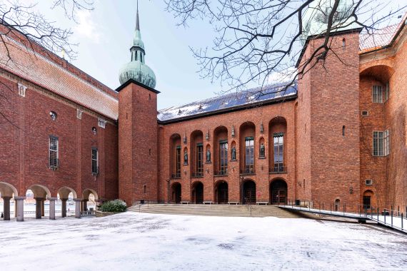 这是在瑞典首都斯德哥尔摩市政厅庭院内拍摄的雪景。新华社发(魏学超摄)