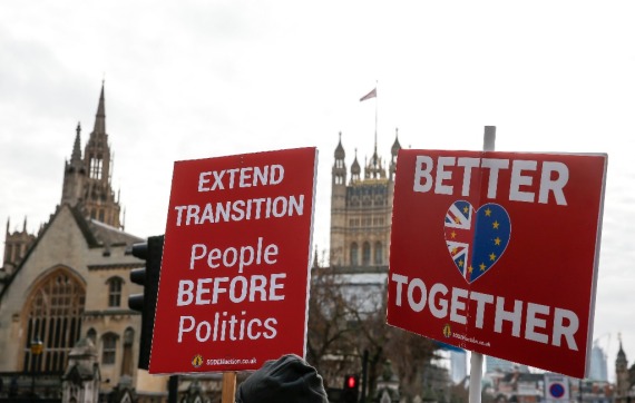 2020年12月9日,反对“脱欧”的示威者手举标语牌站在英国伦敦议会大厦外。新华社记者韩岩摄
