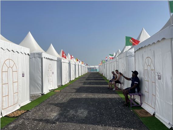 海湾冬日的太阳依旧炽热,来自伊朗的球迷伊赫桑穿着短裤背心经过,见到来自中国的记者非常高兴,他与一位年纪较大的朋友住在一顶帐篷里,两人分担房费,大大减轻了压力。住在对面帐篷的是来自伦敦的球迷穆罕默德,天下球迷一家,三人一见面就成了朋友。穆罕默德谈起房价有些“肉疼”,他说只能在这里住三天,看完一场英格兰队的比赛就回国。