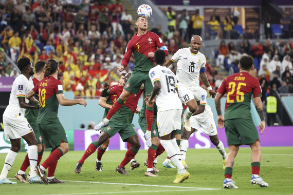 11月24日,葡萄牙对阵加纳,图为葡萄牙队球员C罗(上)在比赛中争顶。新华社记者曹灿摄