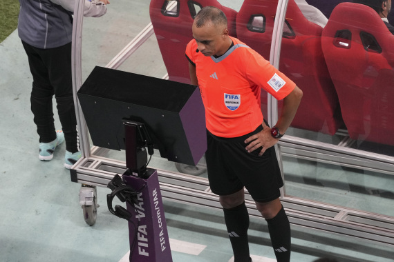 12月10日,英格兰队对阵法国队的比赛中,主裁判正在查看VAR。新华社记者 孟永民 摄