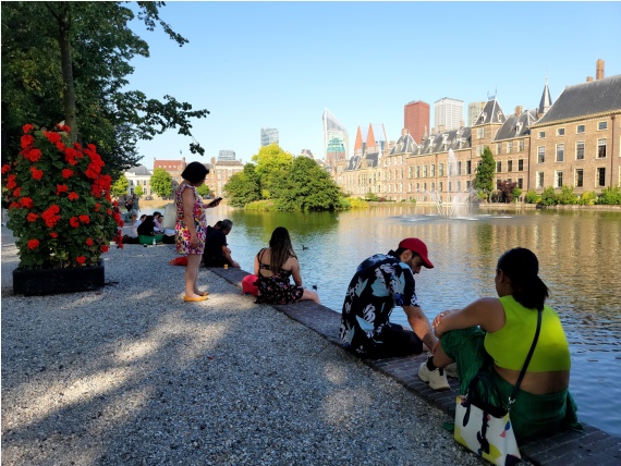 2022年7月19日,在荷兰海牙,人们在议会大厦附近的树荫下消暑纳凉。(新华社记者王湘江摄)