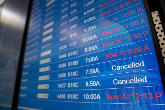 1月11日,在美国弗吉尼亚州阿灵顿的里根国家机场,信息显示众多航班延误或取消。新华社记者刘杰摄