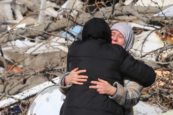 2月7日,灾民在土耳其南部卡赫拉曼马拉什市一处地震废墟前相互安慰。新华社发(穆斯塔法·卡亚摄)