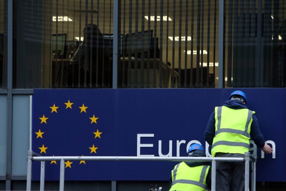 2020年1月31日,在英国北爱尔兰贝尔法斯特,工人们摘掉欧盟委员会在当地办公室的标志牌。英国于当天23时正式“脱欧”。新华社发(保罗·麦克兰摄)