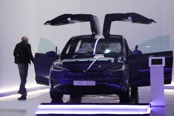 1月13日,一名男子在比利时布鲁塞尔举办的第100届布鲁塞尔车展媒体预展上参观特斯拉Model X汽车。(新华社记者郑焕松摄)