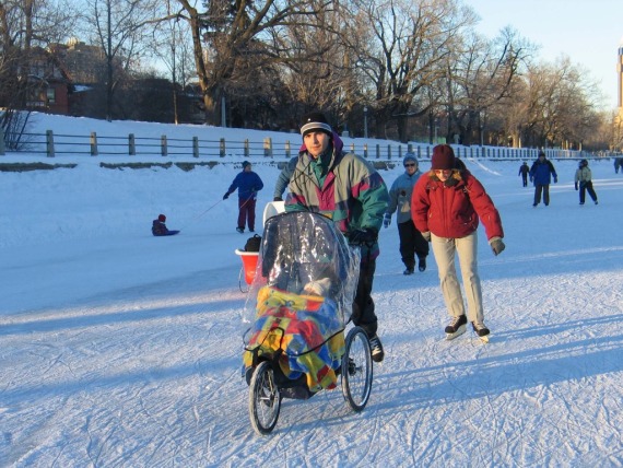 2004年2月19日,在加拿大首都渥太华,一对年轻的父母推着童车,让孩子一起分享在成为一条长达8公里滑冰道的里多运河上滑冰的乐趣。每年2月,渥太华的“冬季狂欢节”就在这里举行。 新华社记者胡光耀摄