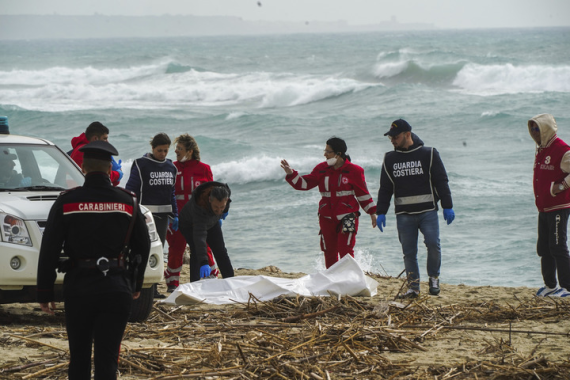 2月26日,在意大利南部卡拉布里亚大区库特罗附近,红十字会志愿者和海岸警察发现一具移民船沉船事故遇难者遗体。新华社/美联