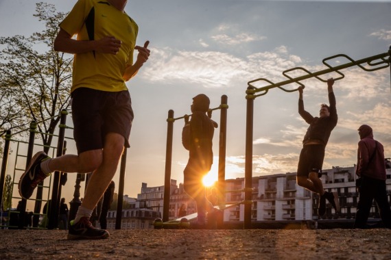 2020年4月12日,人们在法国巴黎街头锻炼身体。新华社发(奥雷利安·莫里萨尔摄)