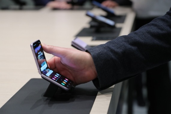 2022年3月3日,参观者在西班牙巴塞罗那2022世界移动通信大会的三星公司展区体验Galaxy Z Flip3手机。(新华社记者郑焕松摄)