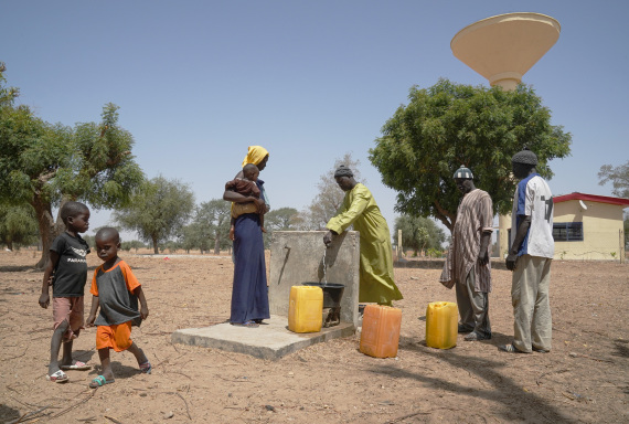 2023年3月20日,在塞内加尔久尔贝勒区的泰内富勒村,村民等待取水。新华社记者韩旭摄