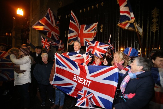 2020年1月31日晚,在英国北爱尔兰贝尔法斯特,支持“脱欧”的人们参加庆祝集会。新华社发(保罗·麦克兰摄)