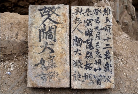 “墓坑中发现多枚开元通宝铜钱、铜镜、装饰蚌壳、铜合页及两件施有白色彩绘的泥质红陶罐等遗物。”岳洪彬说,重要的是两块有确切时间记载并且字迹清晰的墓志砖,对我们了解墓葬的年代和墓主人的身份,以及上下叠压的城墙年代具有重要参考价值。