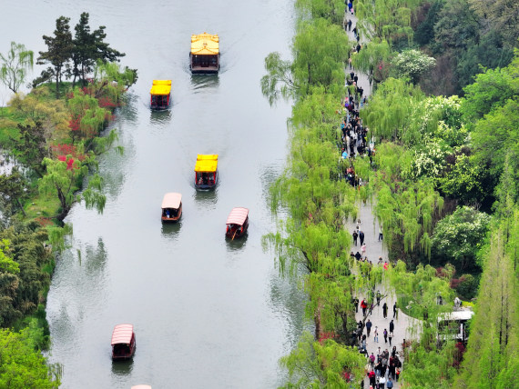 4月5日,游客在江苏扬州瘦西湖风景区游玩(无人机照片)。新华社发(孟德龙 摄)