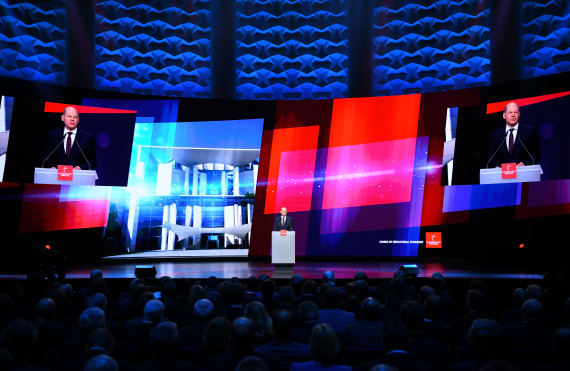 图为2023年4月16日,德国总理朔尔茨在汉诺威工业博览会开幕式上致辞。(新华社记者任鹏飞摄)