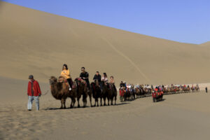 游客骑着骆驼在鸣沙山月牙泉景区游览(4月29日摄)。新华社发(张晓亮 摄)